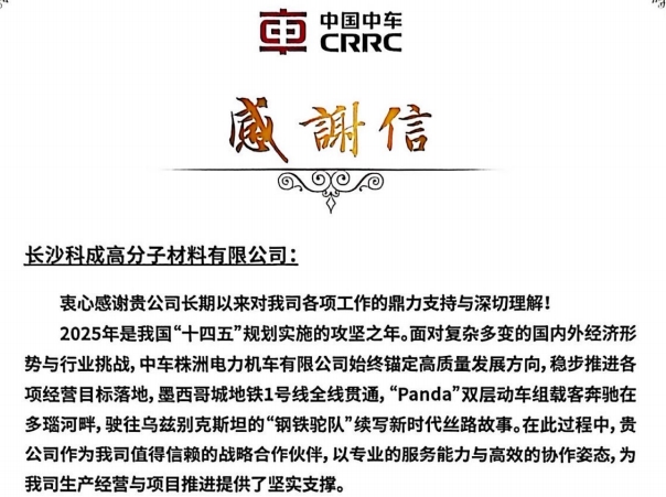 长沙科成高分子材料有限公司成立于2009年6月10日,前身是湖南省塑料研究所技术中心,也是湖南省高分子材料应用技术重点实验室的主体单位,主要从事铁路机车配件产品和军工配套新材料的开发和生产,产品广泛应用于轨道交通、航天航空和工程机械方面。公司拥有一支职业素养高、整体实力强,创新、敬业、协作的职工队伍。